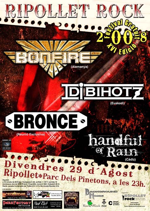 El próximo 29 de agosto se celebrará en Ripollet (Barcelona) la decimosexta edición del festival Ripollet Rock. Este año contará con Bonfire, desde Alemania, Idi Biotz, Bronce y Handful of Rain. Los conciertos empezarán a las 23:00 h., gratis, en un parque a las afueras del pueblo.