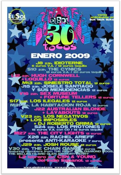 La Sala el Sol de Madrid cumple 30 años y lo celebra con una serie de conciertos exclusivos que arrancan el lunes con la actuación de Loquillo (en acústico) y Hugh Cornwell, el martes 13 estarán Siniestro Total. Podéis ver la lista completa en la noticia extendida. Esperamos y deseamos que cumplan muchos más, que, como están las cosas en la capital, tiene su mérito.