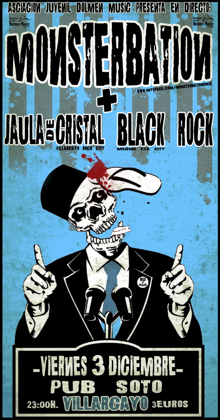 Siguiendo con el afán de difundir nuestra música y la música en general, desde la asociación estamos programando diferentes actividades, empezando por un concierto presentación el viernes 3 de Diciembre en el el Pub Soto (antiguo matadero de Villarcayo), en el que actuarán varias bandas: Monsterbation (con miembros de los extintos Toxic Squeak, Subzero, Dear Twit, y de los actuales The Sulfators), Jaula de Cristal (grupo jovencísimo de Villarcayo) y Black Rock (grupo aún mas joven de Medina de Pomar). Los conciertos empezarán a las 23:00 horas y la entrada será de 3€.
