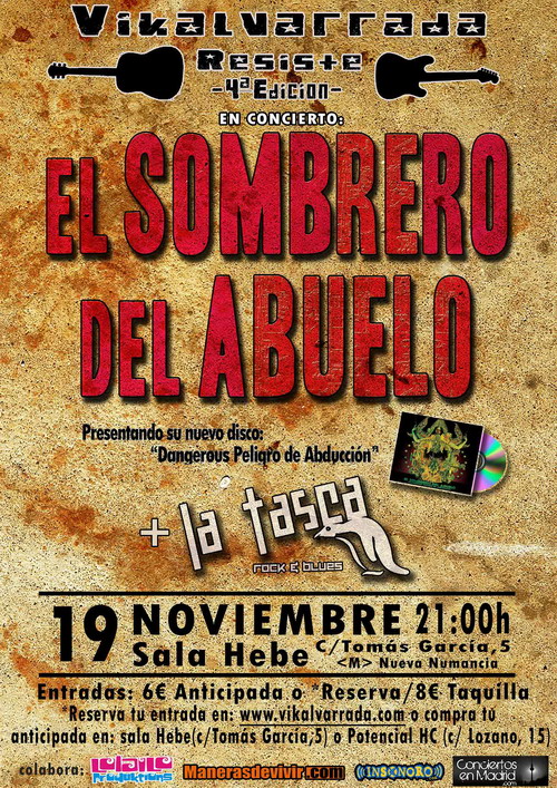 Vikalvarrada 2012 ya está en marcha. Después del festival del pasado mes de julio y los conciertos previos, volvemos a la carga para cerrar un año cargado de música en directo. Y qué mejor forma de hacerlo que volviendo a la carga con la IV edición del Vikalvarrada Resiste. El próximo sábado 19 de noviembre, en la mítica sala Hebe, contaremos con la presencia de El sombrero del abuelo, que presentará su nuevo disco Dangerous - Peligro de Abducción y vienen acompañados del trío madrileño La Tasca, con los que ya contamos en nuestra pasada edición del festival. Los conciertos empezarán a las 21:30h (apertura de taquilla a las 20:00h). Podéis conseguir las entradas de forma anticipada por 6€ en vikalvarrada.com o en Potencial HC y en las taquillas del Hebe. Aforo limitado. Cartel: