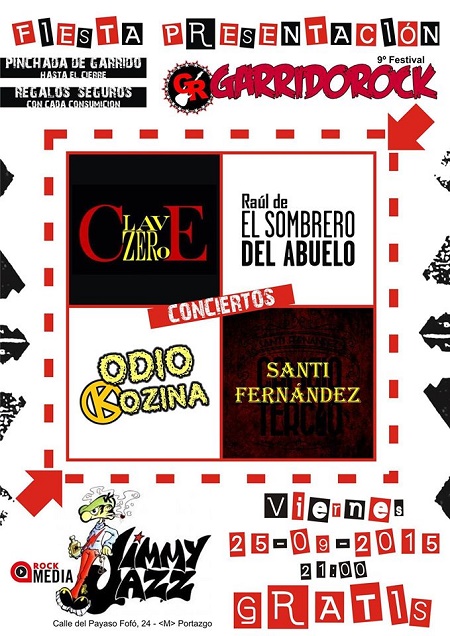 El próximo viernes 25 de septiembre tenemos una cita en el Jimmy Jazz de Vallekas con la fiesta de presentación del 9º Festival GarridoRock. Habrá pinchada de Garrido, regalos con cada consumición y las actuaciones de Clave Zero, Raúl Del Amo de El Sombrero del Abuelo, Odio Kozina y Santi Fernández, todo esto gratis. Una gran fiesta previa a la que vamos a liar el 17 de octubre en Sala Penélope Madrid con Def Con Dos (Dos Tenores Def), Envidia Kotxina, Debruces y Discordia. Las entradas para el festival están a la venta por 10€ en Ticketbell.